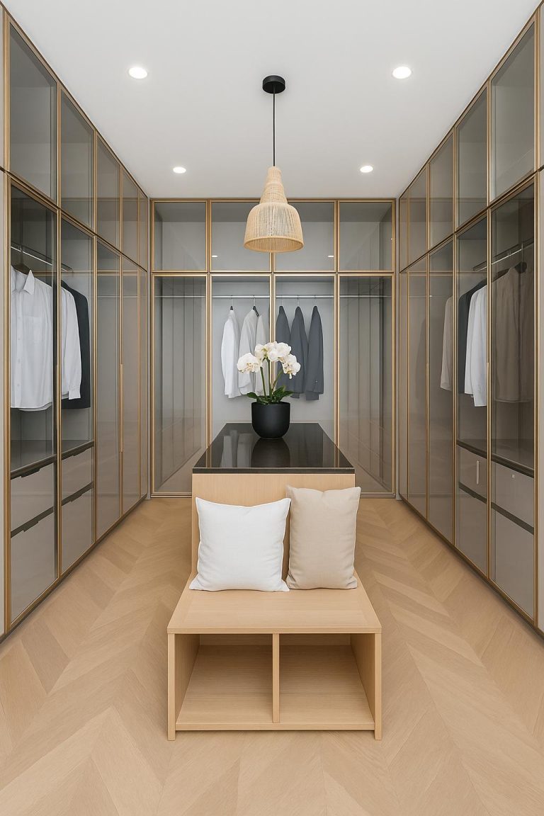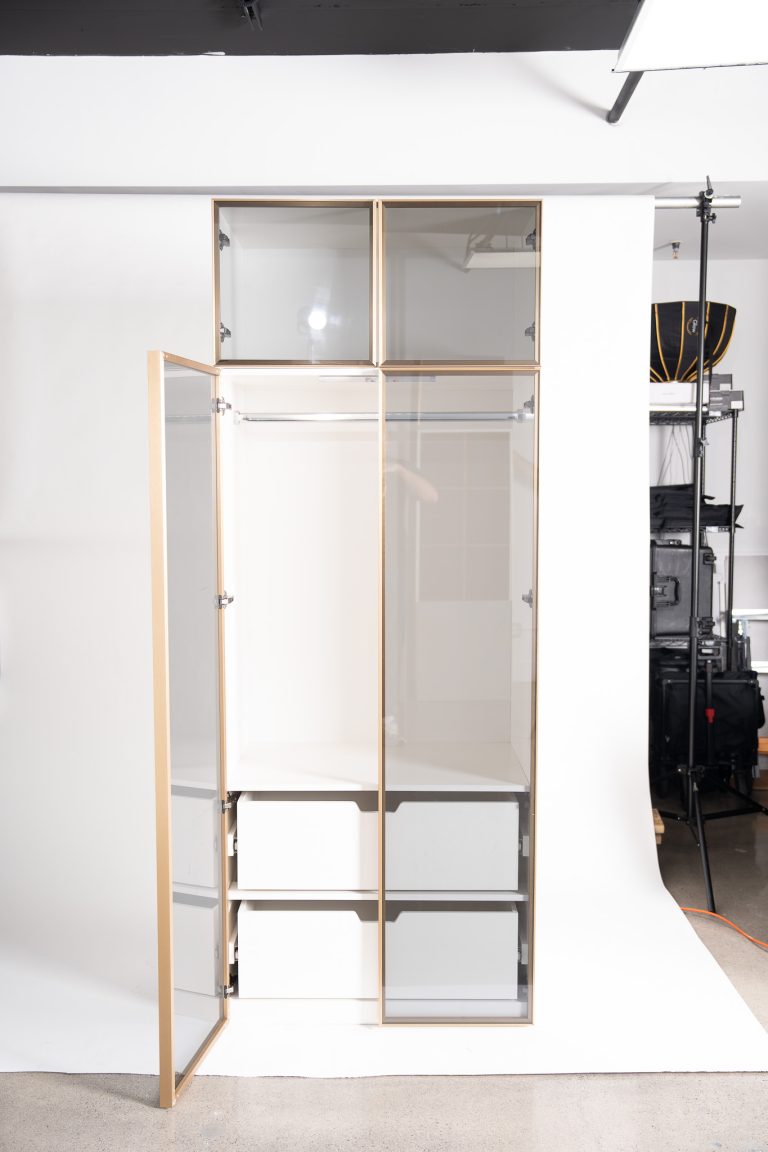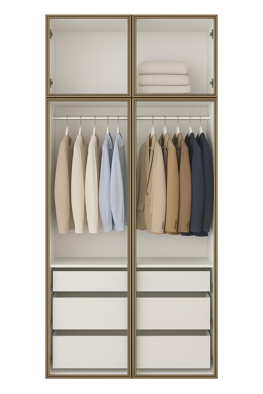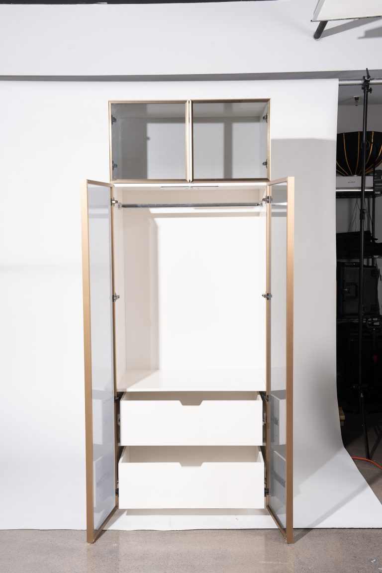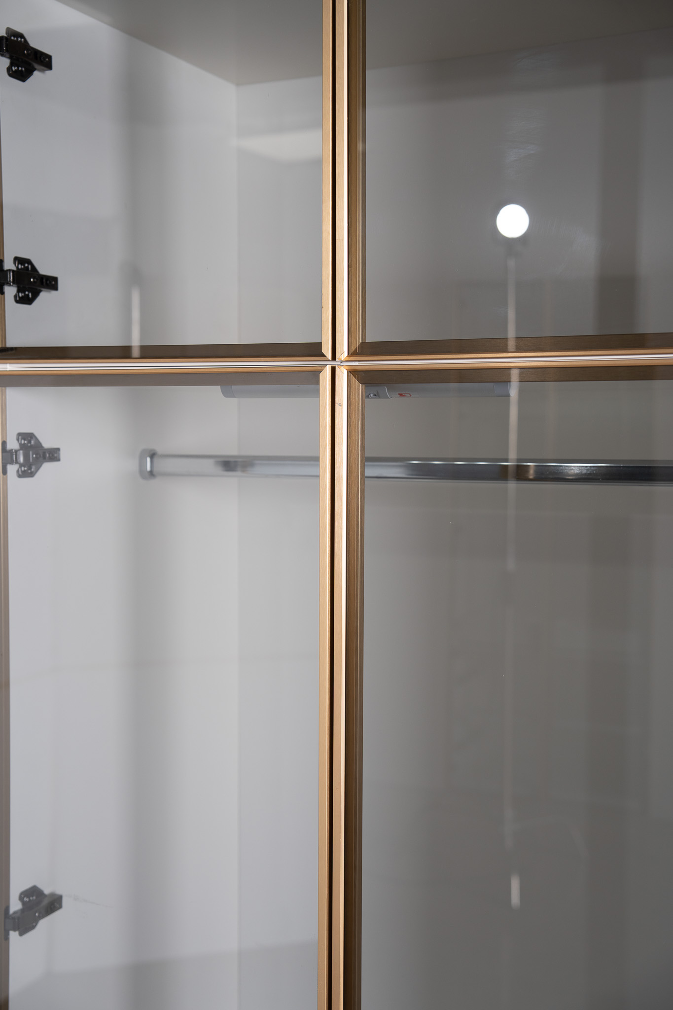 Featuring glass panel doors with elegant gold framing, Cabinet B adds visual openness and lightness, making it ideal for bedrooms, walk-in closets, dressing rooms, or high-end apartments. The interior layout provides organized storage for clothing, accessories, and display items, balancing function with style, included with jewelry drawer.